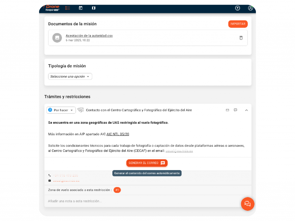 Una vez que haya completado los trámites asociados a sus zonas de vuelo, solo le queda enviar sus solicitudes con un clic a las autoridades: ENAIRE, AESA…
