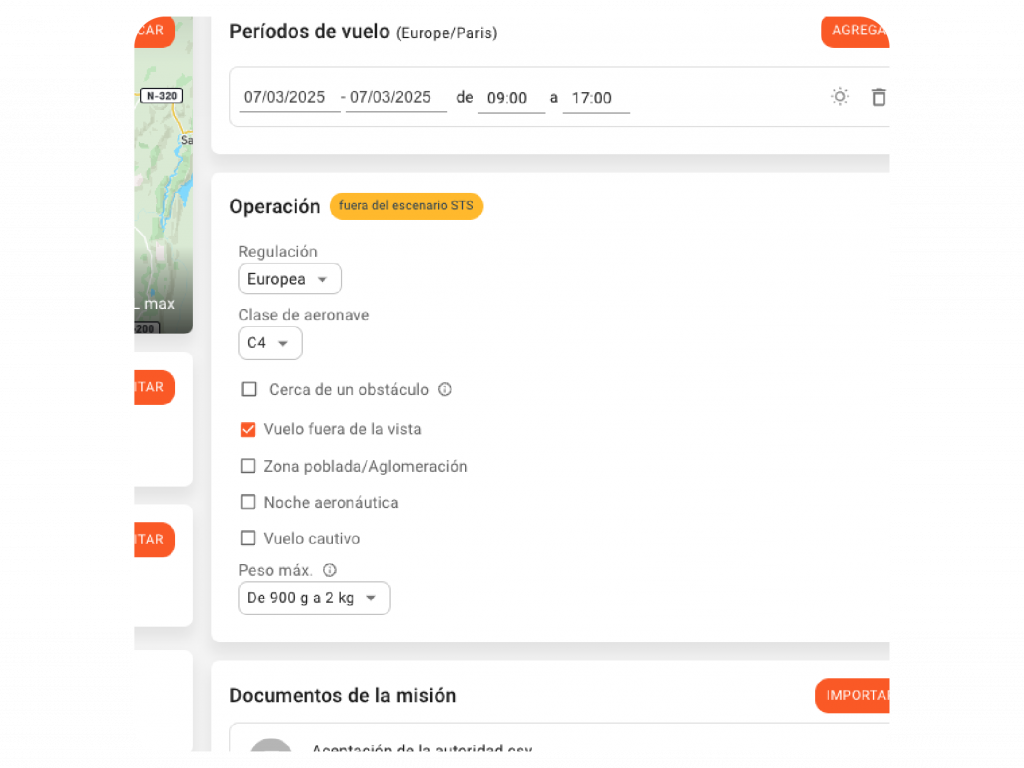 Con un solo clic, defina las características de su misión de drones: los drones utilizados, las fechas, el escenario, la normativa y los impactos asociados aparecerán automáticamente.
