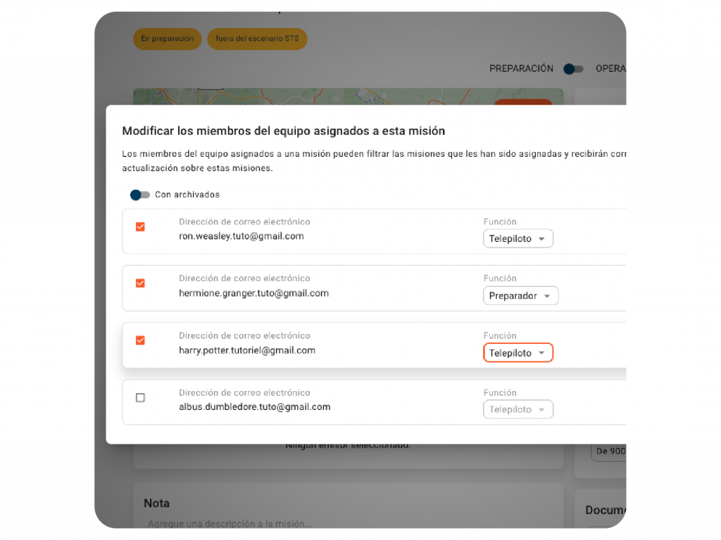 Empresa: si dispone de una flota de telepilotos y/o drones, puede asignar una misión o incluso una tarea dentro de la misión a la persona adecuada. ¡De esta manera, gestionar su flota se vuelve aún más sencillo!