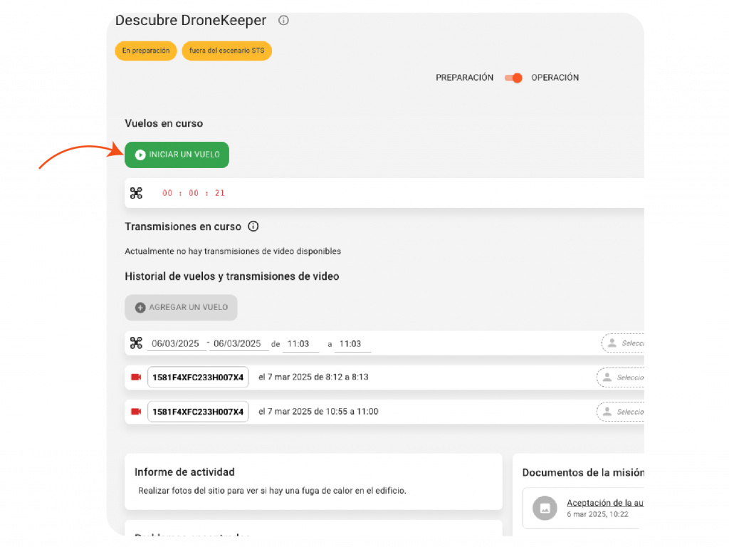 Una vez que su dron esté vinculado, al presionar este botón, podrá ver desde su espacio DroneKeeper lo que ve su dron en directo. ¿Sus colegas están en la oficina y necesitan información en tiempo real?