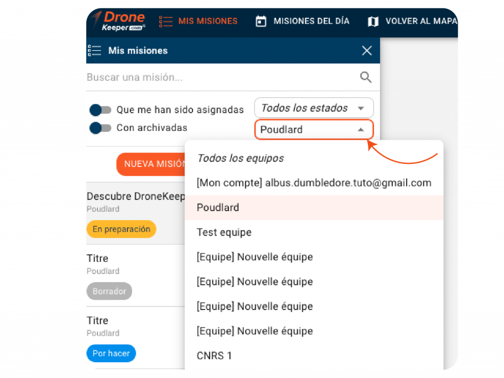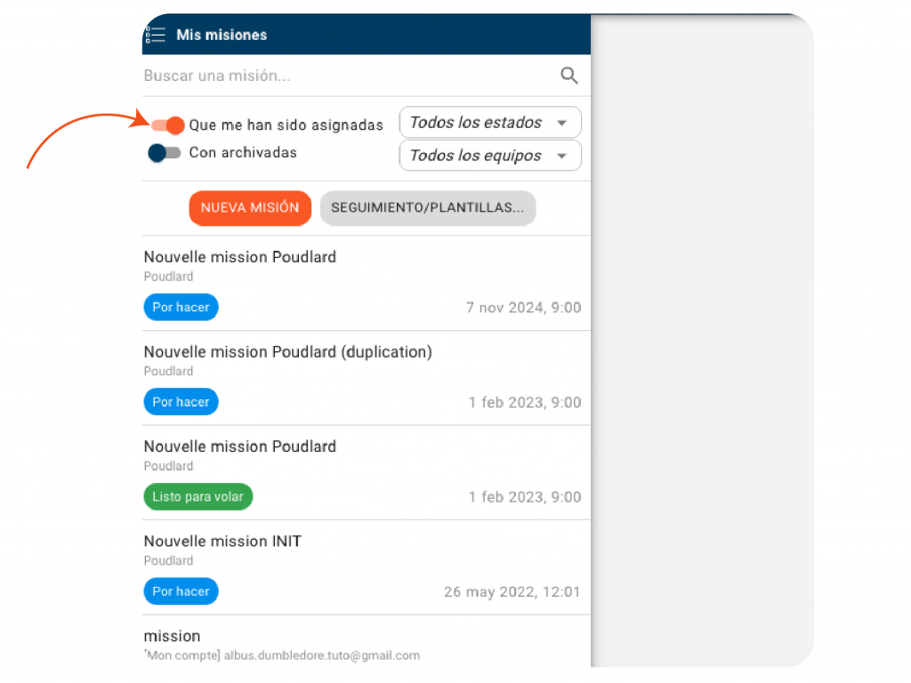 Filtre sus misiones por piloto remoto o por dron. Si trabaja en equipo, también puede filtrarlas según si le conciernen o no.
