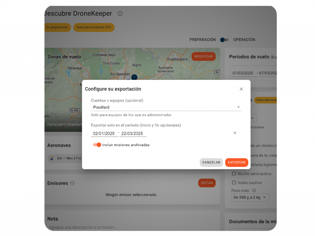 Exporte sus misiones realizadas durante el año con los tiempos de vuelo del dron asociados a cada una de ellas y la tipología de misión realizada con un dron. Descargue su archivo .xls con toda la información.